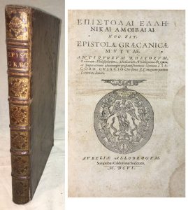 [Jacques CUJAS]. — Epistolae graecanicae mutuae antiquorum rhetorum... a Jacobo Cujacio,... latinitate donatae. — Aureliae Allobrogum, Caldorianae societatis, 1606, in-folio relié plein veau, dos à nerfs orné, coiffes manquantes, coins...