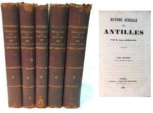 Adrien DESSALLES. — Histoire générale des Antilles. — Paris, 1847-1848, 5 volumes in-8 reliés demi-chagrin rouge, dos à nerfs épidermés, coiffes arasées, tranches peignes.