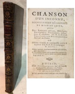 Chrysostome Mathanasius ; sur l'Air des Pendus. — Ou histoire véritable et remarquable arrivée à l'endroit d'un R. P. de la Compagnie de Jésus. — Turin [Rouen], chez Alithophile, 1737, in-12, XXIV et 165 pages, relié plein veau, dos lisse, titre, filets et fleurons dorés, roulette sur les coupes, coins légèrement écrasés.