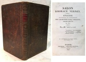 JOUY et JAY. — Salon d'Horace VERNET. — Analyse historique et pittoresque des quarante-cinq tableaux exposés chez lui en 1822. — Paris, Ponthieu, 1822, in-8, relié pleine basane, dos lisse orné, pièce de titre, épidermures, 180 pages.