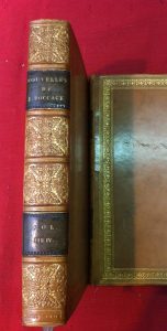 filet, roulette sur les coupes et intérieure, dos ornés d'un décor à la grotesque et d'une double pièce de titre, tranches dorées, gardes bleues, (8), XX, 304 et (2) pages ; (2) 275 et (2) pages, pour le premier volume, et (4) et 243 pages et (2), 293 et (2) pages pour le second.