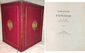 Edmond OUTREY. — Avenir financier de la Tunisie. — Paris, Ghio, 1879, in-8 relié plein chagrin rouge aux armoiries des Beys de Tunisie : Ahmad II, Muhammad VII et Muhammad VIII (1929 à 1957), triple filet d'encadrement, tranches dorées, large...
