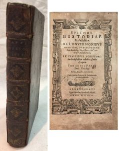 Johann PAPPUS (1549-1610). — Epitome Historiae ecclesiasticae de conversionibus gentium, persecutionibus ecclesiae, heresibus et conciliis oecumenicis. — Argentorati, B. Jobinum, 1596, seconde édition in-8 reliée plein veau, dos à nerfs orné,...