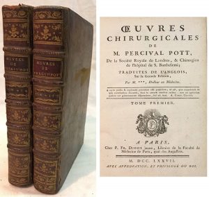 Percival POTT. — Œuvres chirurgicales de M. Percival Pott, de la Société Royale de Londres, et Chirurgien de l'hôpital de S. Barthelemi. — Paris, Didot jeune, 1777, 2 volumes reliés plein veau épidermé, dos à nerfs avec double pièce de...