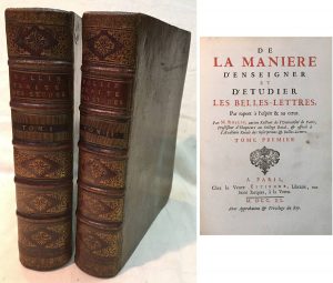 Charles ROLLIN. — De la Manière d'enseigner et d'étudier les Belles-Lettres par rapport à l'esprit et au cœur. — A Paris, chez la Veuve Estienne, 1740, 2 volumes in-4 reliés plein veau fauve moucheté, dos à nerfs, caissons dorés, pièces...
