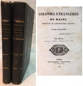 Victor SCHOELCHER. — Colonies étrangères et Haïti, résultats de l'émancipation anglaise. — Paris, Pagnerre, 1843, 2 volumes in-8 reliés demi-chagrin bleu marine, dos à nerfs légèrement épidermés, tranches peignes, [6], 390, [2], et 488...