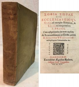 Sophia SEIRACH. — Sive Ecclesiasticus, graece ad exemplar Romanum, et latine ex interpretatione J. Drusii, cum castigationibus sive notis ejusdem, ad reverendissimum in Christo patrem D. Johannem Whitgiftum. — Franekerae, Aegidius Radaeus, 1596,...