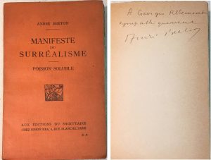 André BRETON. — Manifeste du Surréalisme. — Poisson soluble. — Paris, Éditions du Sagittaire, Kra, 1924, in-12 broché, couverture orangée imprimée en noir, 190 pages et 3 ff.