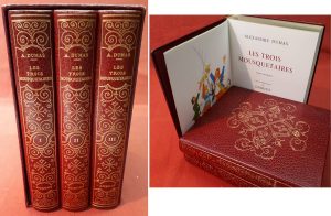[DUBOUT] Alexandre DUMAS. — Les Trois Mousquetaires. — Paris, Sauret, 1968, 3 volumes in-8 en pleine reliure reliure et emboîtage, illustrés en couleurs par Albert Dubout. — Exemplaire numéroté sur vélin.