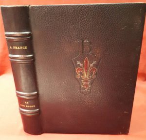 Anatole FRANCE. — Le Lys rouge. — Paris, Romagnol, 1903, relié plein maroquin prune avec une fleur de lys mosaïquée au centre du premier plat, dos à nerfs, gardes peintes, contreplats de maroquin rouge, bordés de 4 filets dorés...