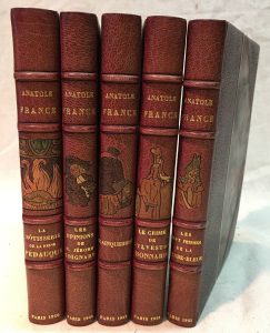 Anatole FRANCE.— Ensemble de 5 volumes : — La Rotisserie de la Reine Pédauque - Les Opinions de Monsieur Jérôme Coignard - Crinquebille, Putois, Riquet et plusieurs autres récits profitables - Le Crime de Sylvestre Bonnard - Les sept Femmes...