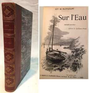 Guy de MAUPASSANT. — Sur l'eau. — Paris, Marpon et Flammarion, sd. (1888), in-12 relié demi-chagrin rouge, dos à nerfs orné de filets et d'un décor doré, tête dorée, couverture illustrée conservée, mors fendillés, 246 pages.
