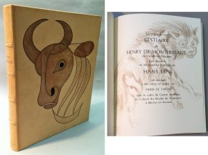 [ERNI] Henry de MONTHERLANT. — Histoire Naturelle Imaginaire. — Paris, Bièvres, de Tartas, 1979, relié plein veau blond créé par Erni, décoré sur le plat d'une tête de taureau mosaïquée, dos à nerfs, sous étui de toile orangée à...
