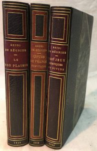 Henri de REGNIER.— Ensemble de 3 volumes : — Le Bon Plaisir - Contes de France et d'Italie - Les Jeux rustiques et divins. Paris, Crès, 1918, 1912 et 1925, reliés demi-maroquin à coins, signés de Aussourd et Bernasconi pour le second, dos...