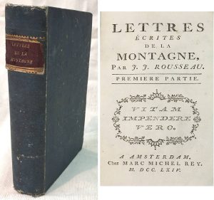 Jean-Jacques ROUSSEAU. — Lettres écrites de la Montagne. — A Amsterdam, chez Rey, 1764, 2 parties en 1 volume in-8 de (2), VIII et 248 pages suivies de (4) et 168 pages, relié dans son plein cartonnage bleu d'attente, avec dos lisse et pièce...