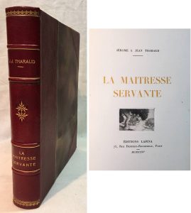 [BALANDE] Jérôme et Jean THARAUD. — La Maitresse Servante. — Paris, Lapina, 1924, in-4 relié demi-maroquin rouge à coins, dos à quatre nerfs sautés, décoré de filets dorés, d'un fleuron et d'une frise en tête et en queue, couverture...