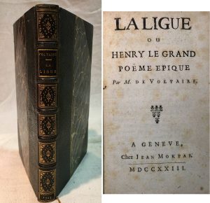 François Marie Arouet, dit VOLTAIRE. — La Ligue ou Henry le Grand. Poème épique. — Genève [Rouen], Mokpap [Viret], 1723, in-12 relié demi-maroquin vert à coins, dos à nerfs avec double filet d'encadrement et décor au petit fer dans chaque...