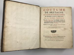 Monsieur *** [MOTAIS] — Coutume de Bretagne et usances particulières de quelques villes et territoires de la mesme province. — 1 vol. in-4 relié plein veau époque, dos à nerfs à caissons fleuris. — Nantes Nicolas Verger 1725 (1ère éd.).