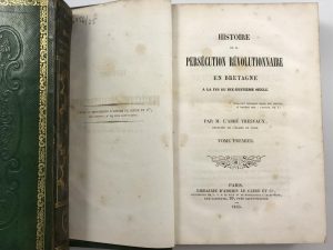 TRESVAUX (Abbé) — Histoire de la persécution révolutionnaire en Bretagne à la fin du dix-huitième siècle. — 2 vol. in-8 reliés pleine basane verte, plats à décor estampé à froid dans un encadrement d'une dentelle dorée, dos lisse à...