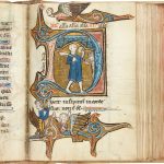 GRANDES MINIATURES & RICHEMENT ENLUMINÉ. Origine Paris (?) [présence de saint Denis]. C omposition 339 ff. portant 15 ou 16 lignes calligraphiées à la page et composés ainsi : ff. 1 & 2 (ajoutés peu de temps après) : invocations diverses ; ff. 3-7 : commencement de l'Évangile selon saint Jean, confiteor, ave Maria, gloria & autres prières ; ff. 7 v° - 13 v° - : calendrier ; ff. 14-339 : psaumes de David ; ff. 340-343 (ajoutés au XIVe ou au XVe s. ?) : invocations diverses. [2] + 333 (chiffrés par erreur 337 au crayon) + [4] ff. Illustrations & ornementations Douze petites miniatures pour les mois du calendrier (signalant des caractéristiques saisonnières) ; quinze grandes miniatures insérées dans des lettrines : f. 12 : le Christ et la sainte Vierge ; f. 50 v° : le Christ et le roi David (accompagné en pied d'un personnage portant sa lyre) ; f. 95 v° : le roi David adoubé ; f. 97 : le fou du roi (psaume 53) ; f. 145 : le roi David faisant sonner les cloches ; f. 171 v° : les trois moines ; f. 175 : le roi David en prières ; f. 256 v° : idem ; f. 282 : la Sainte Trinité ; f. 291 : saint (Sainte Catherine ?) ; f. 303 : sainte Marguerite et le dragon ; f. 309 : saint Denis ; f. 314 : sainte Marie Madeleine ; f. 318 : la résurrection de Lazare ; f. 328 : saint (avec une épée). ainsi qu'une riche décoration sur l'ensemble des feuillets : lettrines avec longues hampes, certaines particulièrement ornées et en particulier une très grande et très belle au f. 209 v°, et nombreux bouts-de-ligne. Texte rubriqué. P rovenance Deux lignes en français ajoutées sous le texte du f. 337 r° : « Che psaultier de dauid fut donne a seur anthoinette cornaille ». D éfauts Volume dont les marges ont été écourtées lors de la seconde reliure, avec atteinte au bord de quelques miniatures ; accident avec manque dans la marge du f. 191 et au f. 196 (ici avec toute petite atteinte au texte).