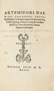 [ARTÉMIDORE d'ÉPHÈSE]. Artemidori Daldiani philosophi excellentissimi, De somniorum interpretatione, Libri Quinque, à Iano Cornario medico physico Francofordensi, latina ingua conscripti. Basileæ per Hieronymum Frobenium & Nicolaum Episcopium,...