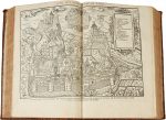 habitables de la Terre, & de la Mer []. À Paris, Chez Michel Sonnius, 1575. 2 volumes petit in-folio (sur 3), veau, dos à nerfs orné (reliure du XVIIe s.). Belle édition française de la Cosmographie universelle de Sébastien Münster initialement parue en 1550, traduite et révisée par le polygraphe et historiographe François de Belle-Forest (1530-1583). Tome Ier, seul, en deux volumes, de cette édition partagée avec Nicolas Chesneau. Ouvrage paginé ou numéroté à la colonne. [XX] ff. (titre, textes liminaires & tables) & pp. ou col. num. de 5-397 & 1-390 (avec quelques erreurs). [1] p. (titre) + col. 393-1838 + [42] ff. (table). Exemplaire réglé portant des textes sur deux colonnes. Sept planches repliées (toutes dans le premier volume) : une mappemonde, une carte de l'Europe, un plan de Londres, une carte de France, un plan de Paris, une carte d'Allemagne et un plan de Milan, et nombreux bois dans le texte, certains à pleine page (vues, cartes, plans, portraits, blasons et figures diverses, dont une double de monstres marins vers la fin du t. II), dont les grands plans ou vues des villes, sites ou pays suivants : Saint-Denis, Chartres, Châteaudun, Blois, Orléans, Auxerre, Beauvais, St-Omer, Nevers, Bourges, Tours, Paulmy, Rouen, Dieppe, Caen, Poitiers, Angoulême, Périgueux, Auvergne, Clermont, Trèves, Metz, Dijon, Autun, Loches, Semur, Chalon, Mâcon, Lyon, Grenoble, Romans, Valence, Embrun, Nice, Marseille, Aix, Avignon, le Pont du Gard, Nîmes, Auch, Bordeaux, etc Genève, Rome, Venise, Gênes, Mirandole, Parme, Vérone, Florence, Naples, la Sicile, le Valais, Soleure, Berne, Bâle, Rufach, Colmar, Sélestat, Wissembourg, Landau, Spire, Worms, Coblence, Cologne, Anvers, Louvain, Bruxelles, Bolduc, Malines, Chur, Lindau, Fribourg, Bade, Nordlingen, Augsbourg, Heidelberg, Freisingen, Francfort, Vienne, Erfurth & Fulda, Lunebourg, Lubeck, Eger, etc Tableaux généalogiques. Quelques petits accidents ; quelques rousseurs ; page de titre partiellement détachée ; tache d'encre sur le f. 269/270 du t. I ; petite mouillure en tête de quelques feuillets du t. II. « Les augmentations dont Belle- Forest a enrichi cette édition, et qui se rapportent principalement à la France, ne sont pas sans intérêt » (Brunet, III, 1945).