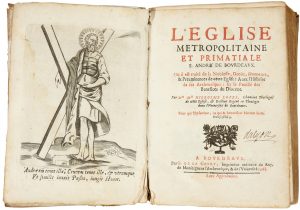 Benefices du Dioceze. A Bourdeaux, Par G. de la Court, Imprimeur ordinaire du Roy, 1668. Petit in-4°, vélin ivoire souple de l'époque. ÉDITION ORIGINALE. Un portrait gravé de saint André en pied en frontispice. Vélin défraîchi avec quelques petites taches et quelques petits accidents ; mouillure ; 2 feuillets déchirés sans manque, quelques autres avec manques en marge ; quelques petites taches d'encre ; 2 feuillets en déficit en fin de volume (pp. 409-412).