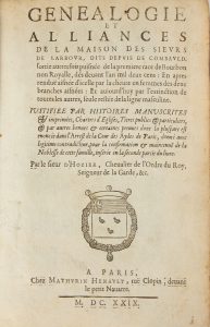 2 titres en un volume petit in-4°, vélin ivoire souple, titre à l'encre au dos (reliure de l'époque). Un titre orné et blasons gravés sur cuivre dans le texte ; tableaux généalogiques, dont un replié, les autres dans le texte. Quelques inscriptions manuscrites marginales anciennes. « Ouvrage assez rare » (Saffroy, III, 43653.