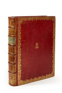 Loix []. A Berlin, et a La Haye, Chez Jean Neaulme, Libraire, 1751. 2 parties en un volume in-4°, maroquin rouge, filet et fines roulettes dentelées dorés encadrant les plats, monogramme couronné au centre, dos à nerfs orné du même monogramme en tête et de fleurons, tranches dorées (reliure de l'époque). « Nouvelle Edition, revuë, corrigée & augmentée. » Un frontispice allégorique, une carte et un tableau généalogique repliés dans la première partie ; un tableau généalogique et une carte également repliés à la fin de la seconde partie ; vignettes d'en-tête, lettrines et culsde- lampe. Coins légèrement émoussés ; quelques épidermures sur le second plat, mais BON EXEMPLAIRE EN MAROQUIN ROUGE ORNÉ DU MONOGRAMME ROYAL. Voir la
