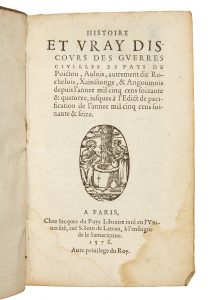 [GUERRES de RELIGION - BRISSON (Pierre)]. Histoire et vray discovrs des gverres civilles es pays de Poictou, Aulnis, autrement dit Rochelois, Xainctonge, & Angoumois depuis l'annee mil cinq cens soixante & quatorze, iusques à l'Edict de pacification...