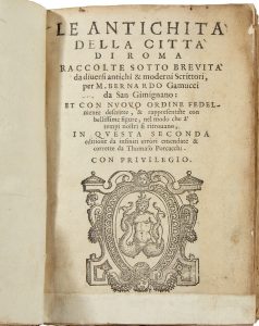 [ITALIE / ROME]. GAMUCCI (Bernardo). Le Antichità dellà Città di Roma []. S.l.n.d. [Vinegia (Venise), Giovanni Varisco, 1569]. In-12 (103 x 148 mm), demi-vélin ivoire, titre à l'encre au dos (reliure du XVIIe s.). « In questa seconda editione...