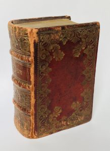 maroquin rouge, filet et large dentelle dorés encadrant les plats, dos à nerfs orné, tranches dorées (reliure allemande ou espagnole du XVIIIe s.). 708 + [II] pp. (table). Les derniers feuillets sont occupés par un « Calendario de las fiestas, y ayvnos, que los Hebreos celebran cada año. Desde el año 5410 [] hasta 5428 que corresponde a [] 1649 hasta 1667 » (26 pp.). Mors fendillés et frottés, feuillets légèrement roussis ; ff. 367/368 & 369/370 en déficit, mais TRÈS BEL EXEMPLAIRE DANS UNE RELIURE EN MAROQUIN À DENTELLE DU XVIIIe SIÈCLE.