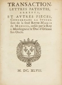 [MARIE de MÉDICIS]. Transaction, lettres patentes, arrests, et autres pieces, concernans la succession de la feuë Reyne Marie de Medicis, cedée par le Roy à Monseigneur le Duc d'Orleans, son oncle. S. l. [Paris], 1648. Petit in-4°, bradel,...