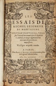 augmenté d'un tiers outre les precedentes impressions » est la deuxième donnée par Marie Le Jars de Gournay, avec sa « Preface svr les Essais de Michel Seigneur de Montaigne, par sa Fille d'Alliance ». Un titre orné d'un bois d'encadrement. Mors fendillés, avec petit accident en tête ; mouillure ; 2 feuillets liminaires (tables) rétablis sur onglets. « Édition [] de la plus grande rareté et intéressante à cause de la nouvelle préface où Mlle de Gournay rétracte celle de 1595 » (Tchemerzine, VIII-409).