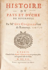 [NIVERNAIS]. COQUILLE (Guy). Histoire du Pays et Duché de Nivernois. À Paris, Chez la Vefve Abel l'Angelier, 1612. Petit in-4°, veau blond, double filet doré encadrant les plats, dos à nerfs orné (reliure de l'époque). ÉDITION ORIGINALE. BEL...