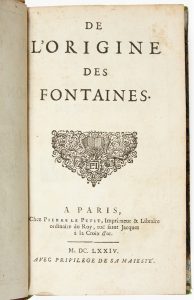 [PERRAULT (Pierre)]. De l'origine des fontaines. À Paris, Chez Pierre Le Petit, 1674. In-12, demi-veau, dos à nerfs orné (reliure mi-XIXe s.). ÉDITION ORIGINALE. Un frontispice allégorique gravé. Mors fendus en tête et épidermure sur le...