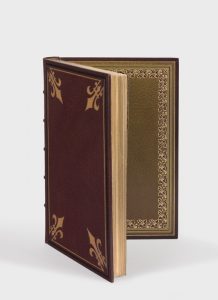 tranches dorées, doublure de maroquin kaki, multiples filets dorés et fleurons mosaïqués en encadrement, gardes de soie brochée amande, couverture et dos, chemise et étui (Marius Michel).
