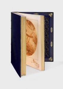 de filets dorés et fleurs mosaïquées, doublure et gardes de soie brochée, couverture et dos, étui (Charles Meunier, 1924) et pour le second, maroquin janséniste bleu nuit, tranches dorées, doublure de maroquin rouge, filets dorés et plaques dorées aux angles, gardes de moire bleu nuit, couverture et dos, étui (René Aussourd).