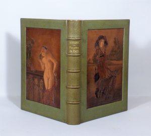 COQUIOT (Gustave). — Poupées de Paris. Bibelots de luxe. — Paris, A. Romagnol, 1912. — In-4, maroquin vert, cuir incisé présentant une élégante aux lévriers sur le premier plat et nue sur le second, tête dorée, non rogné, encadrement...