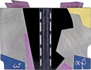 un texte inintelligible. — Sans lieu, ni date. — In-24 (7,3 x 5 cm), reliure à plats rapportés constitués de plaques de métal arasé, de plastique noir, de carton jaune, bleu, rose, dos de basane noire, étui-boîte de toile bleue de grand format dans lequel se loge la reliure (24,2 x 12 cm) (C[laude] D[ebras]. 2010).