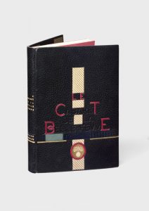 bande de maroquin ivoire à décor de treillage doré, à la base dans un cercle doré, un disque enflammé mosaïqué de maroquin ivoire, décor répété sans le titre au second plat, dos lisse, cadre intérieur orné d'un treillage doré, doublure et gardes de daim bordeaux, couverture et dos, chemise et étui (Pierre Legrain - J. Anthoine Legrain).