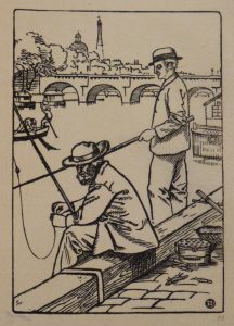 KLINGSOR. — Petits métiers de Paris. — Paris, chez l'artiste, 1904. — In-8, maroquin bordeaux, décor doré représentant un pont de Paris et ses monuments emblématiques, double filet à froid avec motif floral aux coins, dos lisse, titre...