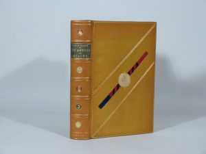 le plat supérieur, chapeau et disque mosaïqués de maroquin turquoise, ivoire et rouge sur le plat inférieur, dos orné, tête dorée, guirlande dorée intérieure, couverture (Reliure de l'époque).