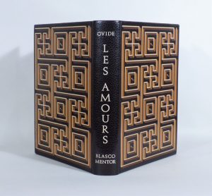 OVIDE. — Les Amours. — Paris, Club du Livre - Philippe Lebaud, 1970.— In-4, chagrin havane, labyrinthe estampé en beige et brun sur les plats, dos lisse, tête dorée, chemise et étui ([Jacques Ébrard, pour l'éditeur]).