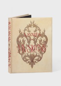 SUARÈS (André). — Musiciens. — Paris, chez l'artiste, 1930. — In-4, bradel vélin ivoire, premier plat orné d'une large composition de feuilles d'acanthe peintes d'or et d'argent avec le titre et le nom de l'auteur calligraphiés en rouge,...