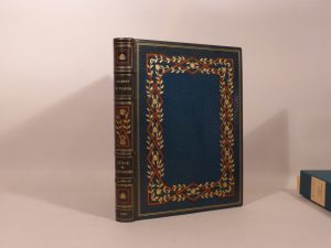 VOISINS (Gilbert de). — Le Bar de la fourche. — Paris, L'Artisan du livre, 1928.— In-4, maroquin bleu, treillis mosaïqué de maroquin rouille sur lequel s'entrecroise un rosier doré, encadré d'un double filet doré sur les plats, dos orné...
