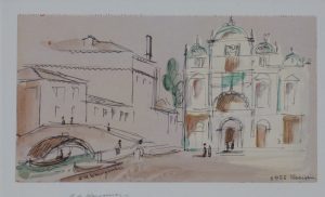 WAROQUIER (Henry de). — Venise. La Scuola Grande di San Marco. — Dessin à l'encre, rehaussé à l'aquarelle, sur papier fin appliqué, signé en bas à gauche. — 11,5 x 20 cm.