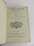 Collectif Almanach Royal pour l’année 1770. A Paris, chez Le Breton, 1770. 1 volume in-8°, reliure d’époque en plein veau avec triple filet doré, fleurs de lys en écoinçon. Dos à nerfs orné de fleurs de lys, pièce de titre en maroquin...