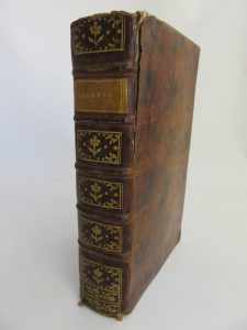 prêtres prouvés par des recherches historiques. Genève chez Pellet, 1781. 2 ouvrages reliés en 1 volume in-8°, reliure d’époque en plein veau, dos à nerfs orné de fleurons dorés, pièce de titre en basane marron clair, titré « recueil ». Coiffes arasées, coins défraichis, mors du plat supérieur fendu sur sa moitié. Le premier ouvrage par Mr de La Folie traite des sciences mais par l’utopie ; le frontispice représente un extraterrestre arrivant de la planète Mercure sur un « aéroplane » électrique lui permettant de venir sur terre exposer ses idées scientifiques. Rare édition originale, très propre et complète de son frontispice très recherché et souvent manquant. Le second volume, aussi en édition originale, traite d’un tout autre sujet. Pourquoi ont-ils donc été reliés ensemble ?