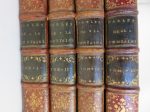 rouge, triple filet sur les plats en encadrement, dos à nerfs ornés de fleurons dorés, pièces de titre et de tomaison en maroquin vert foncé, toutes tranches dorées. Une petite étiquette collée sur la page de titre des deux premiers volumes indique que la reliure a été exécutée par Padeloup relieur du Roy, place de la Sorbonne à Paris. Les 4 volumes sont dans une reliure uniforme ; les dos des volumes 1, 2 et 3 sont insolés et les mors des mêmes volumes sont faibles. Sur l’ensemble, 4 coins sont abimés, les coupes du volume 3 sont légèrement frottées. Exemplaire collationné et bien complet : 3 ff.n.ch. XXX -XVIII -124 pp., 2 ff.n.ch., II -135 pp., 2 ff.n.ch., IV -146 pp., 2 ff.n.ch., II -188 pp. Contient aussi les 275 planches dessinées par Oudry, le frontispice commencé par Oudry et terminé par Dupuy,1 portrait d’Oudry d’après Largillière et gravé par Tardieu. Les graveurs sont Cochin, Tardieu, Prevost … : 70 planches pour le tome I, 68 pour le II, 68 pour le III et 69 pour le dernier volume. La planche 172 « le singe et le léopard » est en premier tirage sans la légende dans la bannière. L’exemplaire est en grand papier impérial d’Auvergne ; dans le filigrane on peut lire le nom d’un fabricant : Dupuy. Tous les feuillets de texte ainsi que les planches ont été réglés à l’encre rouge. Quelques rares piqures sur l’ensemble des cahiers qui sont soit très propres, soit uniformément roussis, rousseurs pouvant atteindre le texte mais aussi certaines gravures. Exemplaire à toutes marges, chaque feuille mesure 48 x 32,5 cm les volumes reliés 49,2 x 34 cm. Cohen 236/237. Relié en plein maroquin et imprimé sur beau papier cet ouvrage, sans doute l’un des plus beau livre illustré du XVIIIème, est toujours recherché.